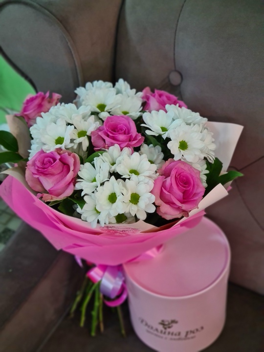 Букет из ромашковидных хризантем Бакарди и розовых красивых роз в нежном оформлении. Цвет розовых роз подбирается, исходя из наличия.