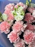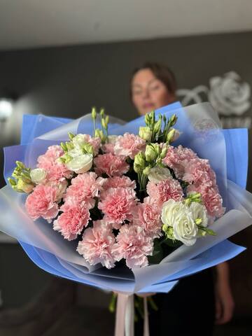 Состав букета : 21 розовая гвоздика , 6 белых лизиантусов, корейская упаковка.