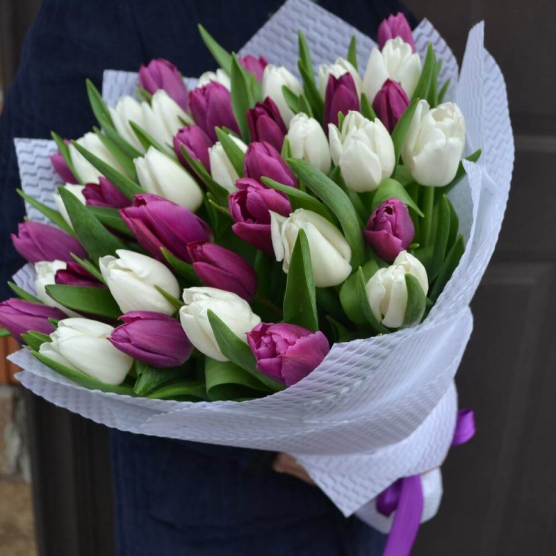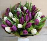 Красивый изысканный букет из фиолетовых и белых тюльпанов. Букет оформляется в красивую по гармоничности упаковку.