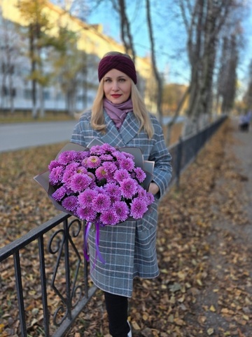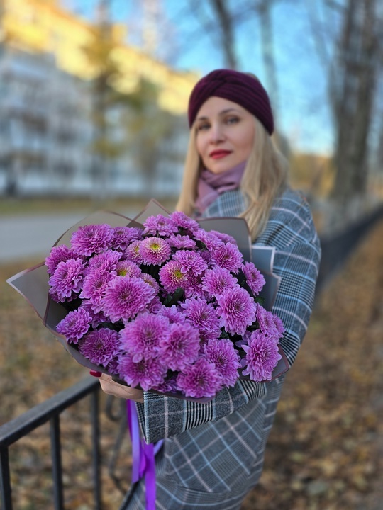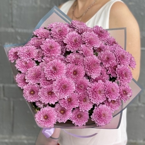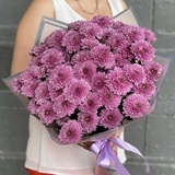 Сиреневые кустовые хризантемы Фабиен (FABIENNE), стойкие долгоиграющие цветы с необычной фактурой бутонов. Букет смотрится очень нежно и романтично.